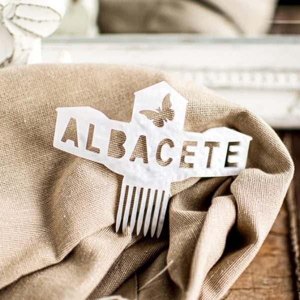 Ya puedes lucirte y resaltar tu belleza con esta peineta nacarada con forma de la Puerta de Hierro de Albacete.