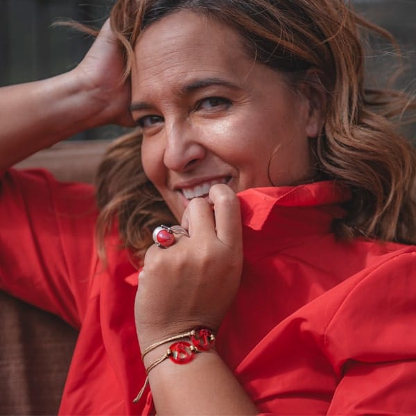 Pulsera de la virgen de los Llanos en metacrilato rojo con cordón dorado autorregulable.